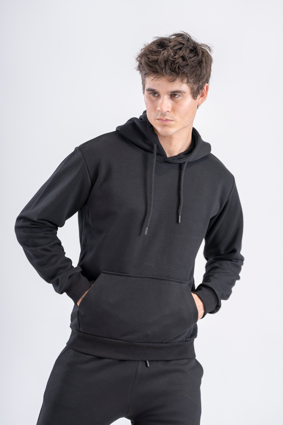 Gmesg Erkek Kapüşonlu Sweatshirt – Uzun Kollu, Üç İplik, Cepli, Rahat Kalıp - Siyah