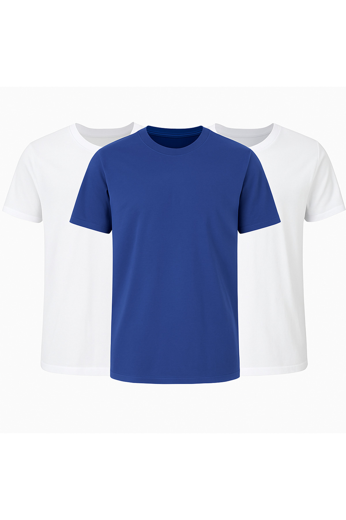 GMESG Erkek 3’lü Basic T-Shirt Seti – Kısa Kollu Düz Renk %100 Pamuk Suprem Kumaş – 2 Beyaz 1 İndigo